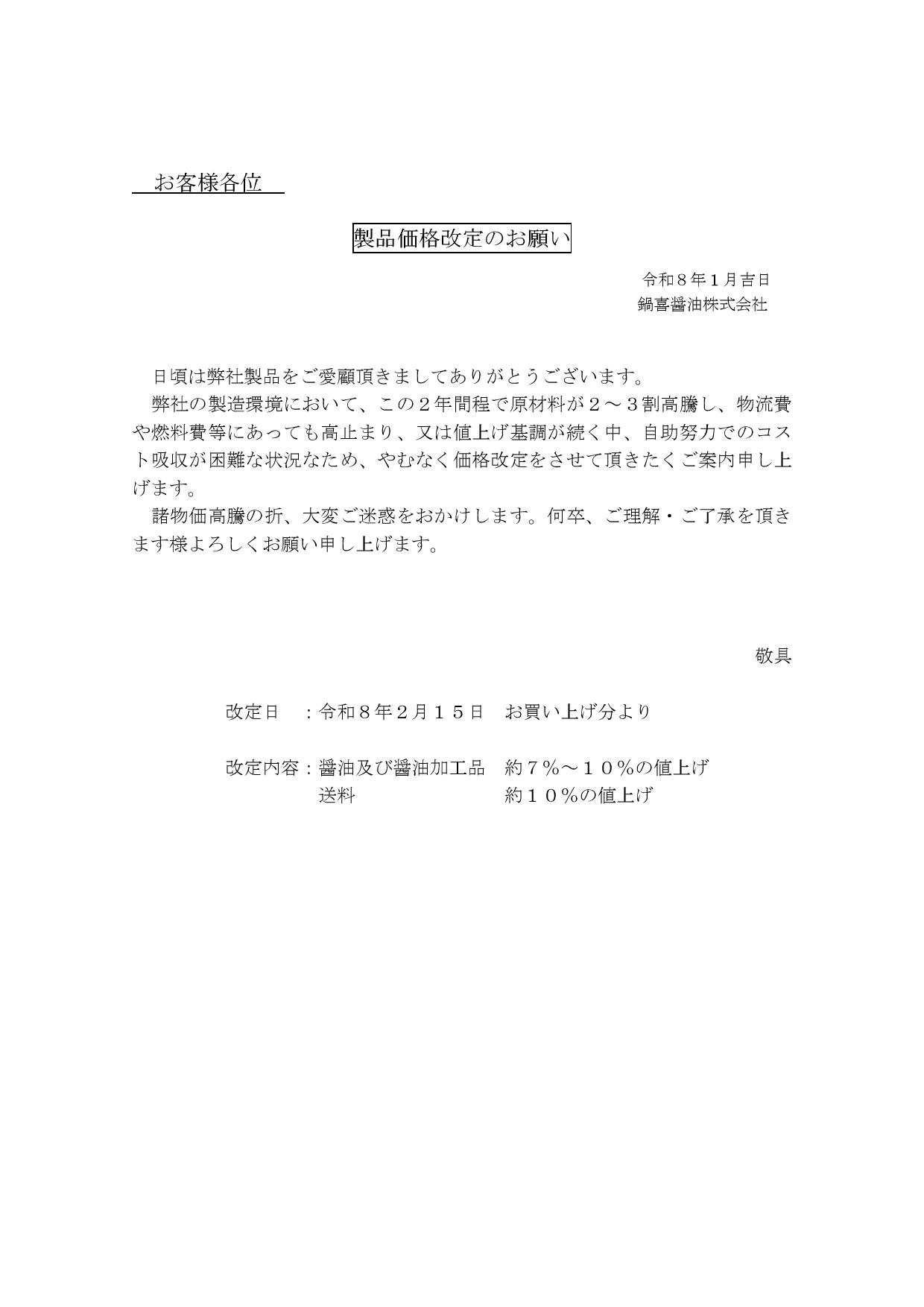 令和8年02月15日よりの価格改定につきまして Filed under: おしらせ お客様各位:いつも鍋喜醤油をご愛顧下さいまして誠にありがとうございます。 大変心苦しいお知らせではございますが2月15日より一部商品及び送料の価格改定をさせていただくこととなりました。
